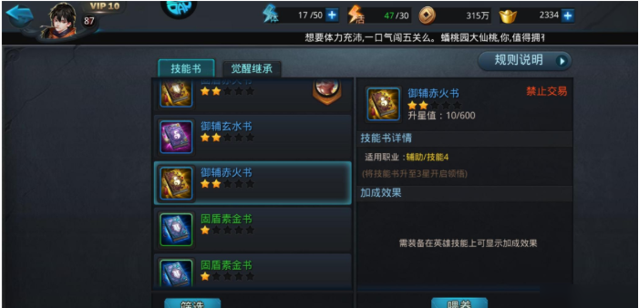 拿到技能书后,升星和领悟是提升效果的核心操作。升星需要消耗同名技能书和对应材料,3本1星技能书加1本随机技能书配合绿霄符就能合成2星技能书。领悟度达到3星后才会生效,使用紫霖露、金霖露等材料可以提升领悟度。每次领悟有50%成功几率,失败不会降级,建议优先把主力英雄的技能书升到3星以上。