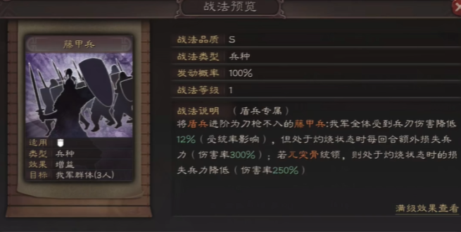 藤甲兵在游戏中是盾兵进阶的核心战法,能大幅降低兵刃伤害,但遇到灼烧状态时会受到致命打击。藤甲兵的核心功能是提供35%-40%的兵刃减伤,效果受统率影响。如果咱们没有藤甲兵或者想避开怕火的弱点,可以选择其他减伤类战法,比如抚辑军民、御敌屏障或暂避其锋。这些战法虽然减伤幅度不同,但胜在稳定性高,不会被灼烧克制。尤其抚辑军民能同时降低兵刃和谋略伤害,适合应对混合输出队伍。