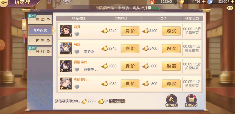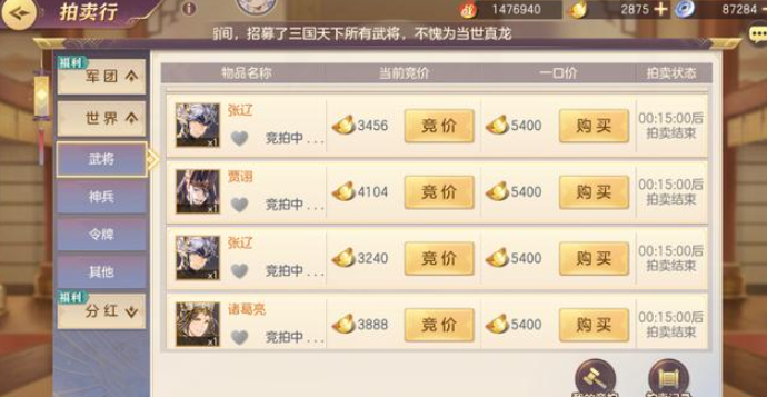 拍卖武将是一个重要的资源获取方式,尤其对于想快速提升阵容的小伙伴来说。拍卖行分为武将拍卖、神兵拍卖和令牌拍卖三种类型,其中武将拍卖可以直接获取心仪的武将或碎片。进入游戏主页面后点击拍卖行,就能看到当前可竞拍的武将列表,遇到想要的武将可以选择竞价或一口价购买。竞价需要和其他玩家竞争,而一口价则能直接锁定目标,避免被抢走。如果商品无人竞拍,时间结束后会流拍,所以看到合适的别犹豫。