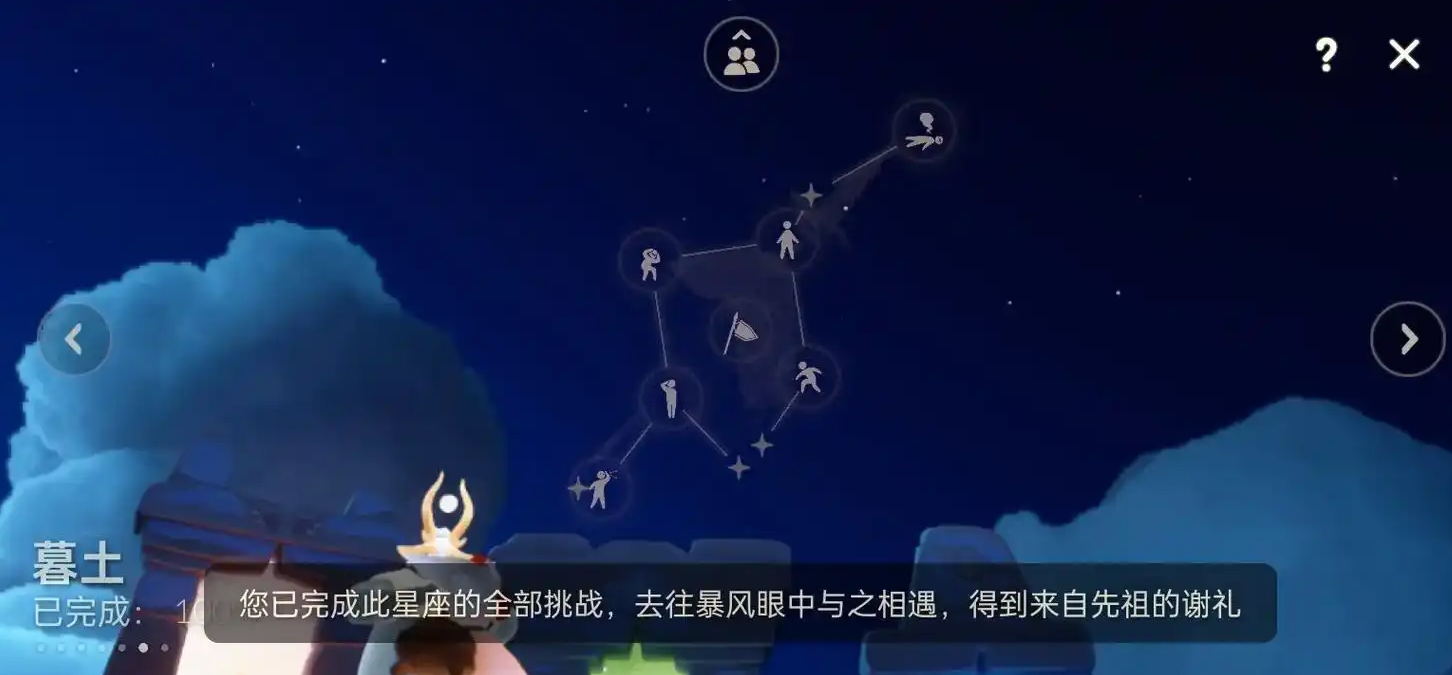 完成墓土先祖全部兑换后,需前往暴风眼进行献祭。献祭过程中需收集光之翼并完成重生之路,在星光大道界面点击暮土星图问号,召唤毕业先祖。兑换龙骨发型需额外消耗2颗爱心,确保提前储备足够爱心资源。
