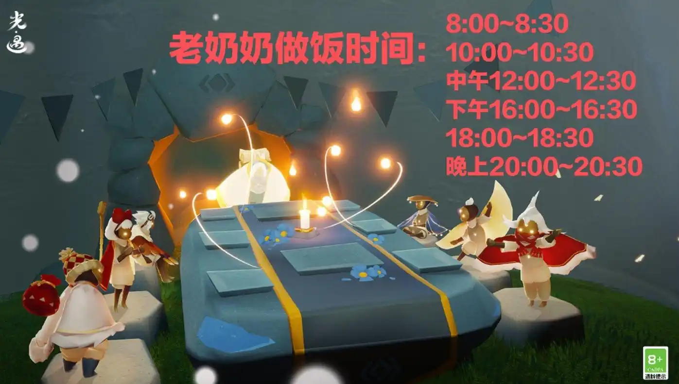 老奶奶挂机机制的核心是通过特定时间段的互动获取烛火奖励。老奶奶每天会在雨林秘密花园的长桌树洞处出现6次,具体时间为上午8点、10点、12点以及下午4点、6点、8点,每次持续30分钟。在这段时间内,玩家可以与老奶奶共同用餐,通过燃烧馒头获得烛火,每日上限为1000点烛火,约等于10根蜡烛。
