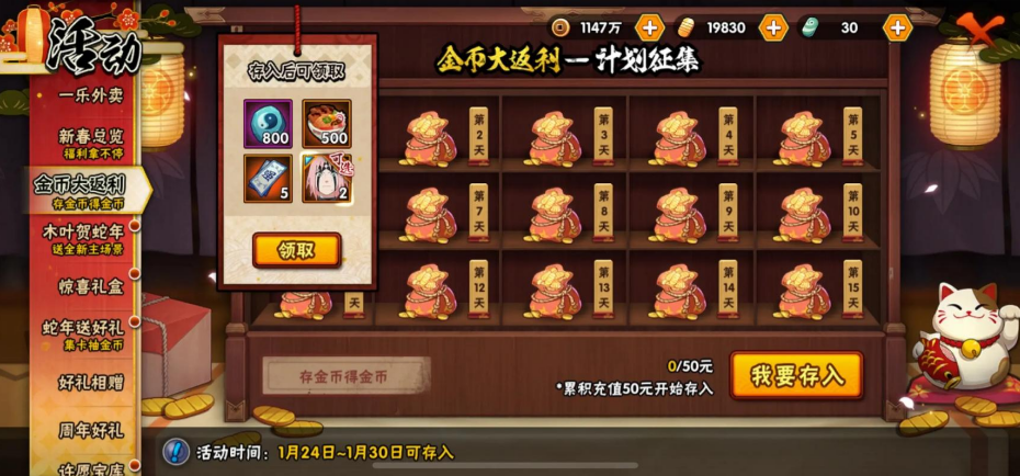 金币不要乱花在B级或C级忍者上,重点攒着抽高招A忍和S忍。新忍者上线首周有首付活动,抽满50次(A忍)或100次(S忍)能额外拿碎片,性价比最高。副本首次通关每章给900金币,优先推主线能快速积累资金。如果打算长期玩,开月卡和参与金币返利活动比直接充值更划算,比如50元返利活动能多拿3200金币。