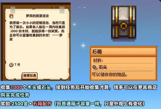 特殊任务栏是游戏右上角的一个功能,会在第一年秋季第二天开启。每周一会刷新两个任务,但咱们每周只能接一个。这些任务通常需要收集物品、钓鱼或打怪,完成后能获得金币、配方或好感度奖励。比如罗宾的硬木任务需要7天内收集80块硬木,奖励包括豪华双人床购买权限和250点好感度。
