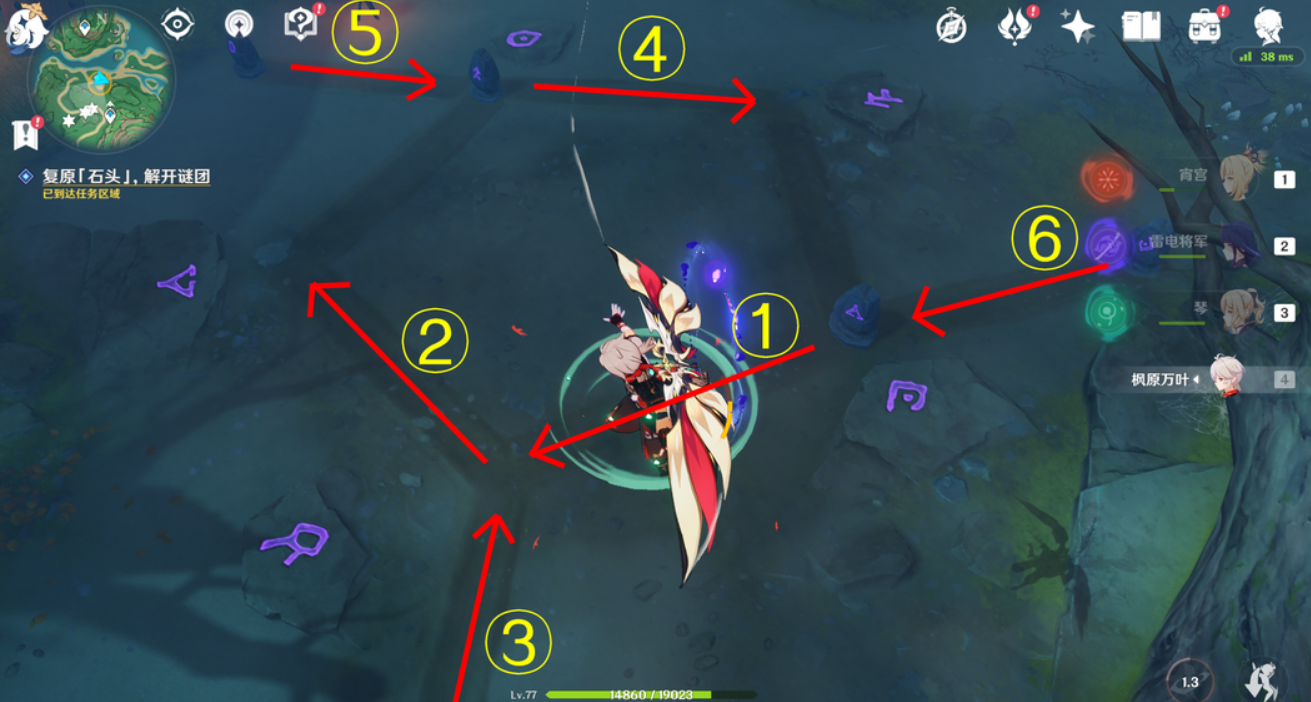 第一块石板在茂知祭场东南方向的悬崖处。来到这里后,用羽毛扫描雷鸟雕像,会出现一个雷灵。跟着雷灵跑到终点,它会停在一个宝箱旁边。这时候再用羽毛扫描附近的雷鸟雕像,墙上会显示符文图案。按照41253的顺序点亮石碑,就能打开宝箱拿到石板。这个解密要注意观察墙壁上的提示,别急着乱点。