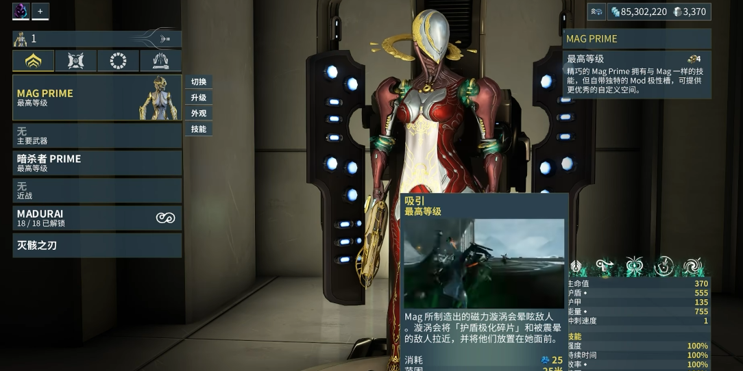 圣装磁力是一套兼顾颜值和功能的战甲,技能以群体控制和范围伤害为主,特别适合清理大量敌人。它的护盾极化技能在对付特定敌人时效果拔群,而且外观设计科技感十足,能量流动的效果非常炫酷。萌新可以通过完成中枢Simaris的声望任务获取蓝图,再刷对应的虚空遗物凑齐部件。