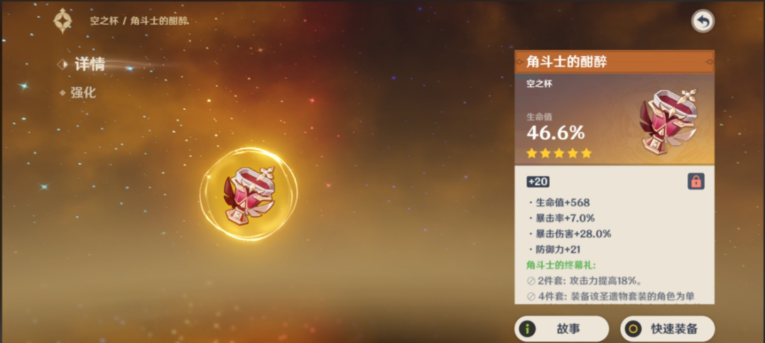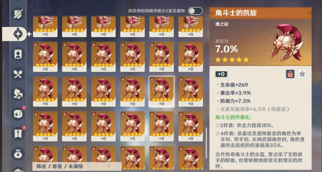拿到角斗士后别急着强化,先看看主词条对不对。沙漏选攻击百分比,杯子选物理伤害或对应元素加成,头冠优先暴击或爆伤。副词条尽量挑带双暴和攻击百分比的,这样强化起来收益更高。平时刷到的垃圾圣遗物也别全分解,留一些当狗粮或者拿去合成台换其他套装。最后角斗士套虽然好用,但没必要硬刷完美属性。毕竟圣遗物这东西挺看脸的,有时候刷几个月都不一定能出极品。建议平时随缘刷,主力角色够用就行,把体力留给更需要提升的地方。