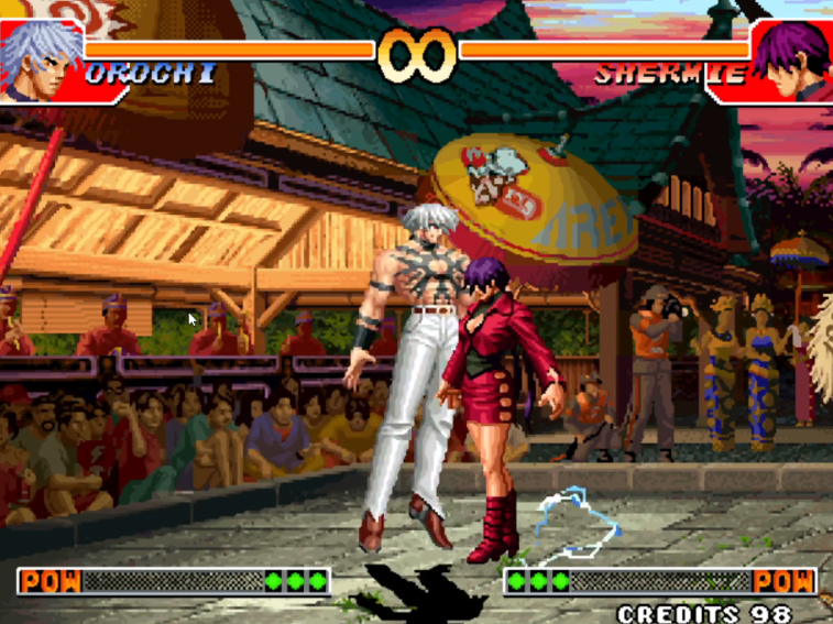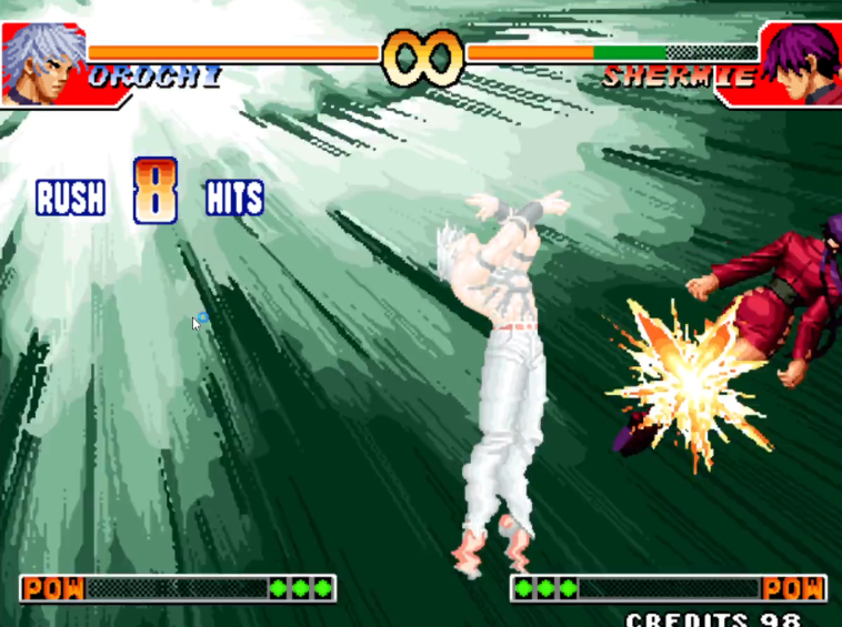 大蛇的另一个强力必杀技是吼大地,指令是↓→↓→A或C,可以蓄力增加伤害。近身时还能用地狱极乐落→↓←→↓←A或C,这招是投技,抓住对手后能造成多段伤害。大蛇的大招虽然霸道,但需要把握好释放时机,否则容易被对手躲开或反击。