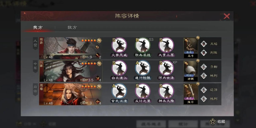 这份打工具体怎么打,首先得看他的工作岗位安排。最常见的阵容就是经典的嘟嘟队,周瑜通常坐在中军的位置。他的职责不是自己去砍出最高伤害,而是要先手行动。因为他的速度比吕蒙要快,所以可以利用这个优势,在战斗一开始就给队友加上各种增益效果。比如给他带上神兵天降和大赏三军这样的指挥战法,能在战斗前三回合极大提升全体的伤害,这样吕蒙的白衣渡江和陆逊的火势风威就能打出毁天灭地的效果。他用自己的行动,给主力输出创造了完美的输出环境,这就是他辅助工作的精髓。