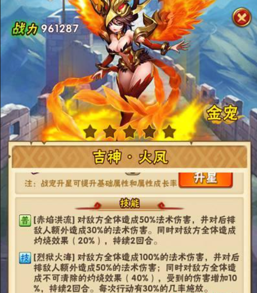除了这些基础的金宠,游戏发展,后期还推出了像凶神·相柳、吉神·火凤、战神蚩尤等更强力的金宠。凶神·相柳的特点是可以减少敌方怒气并让我方进入狂暴状态,提升攻击和暴击,在需要压制对手技能释放的场合很有效。吉神·火凤则非常全能,技能有全体伤害、对后排额外伤害,还能给攻击最高的武将套火盾反弹伤害,并且提供灼烧效果,综合能力很强,一度是PVP出场率很高的战宠。战神蚩尤则拥有高额的全体伤害,对生命值高的目标还有额外打击,并且附带降低治疗和防御的诅咒效果,输出非常暴力。这些战宠技能更复杂,效果也更强大,是你中后期追求的目标。