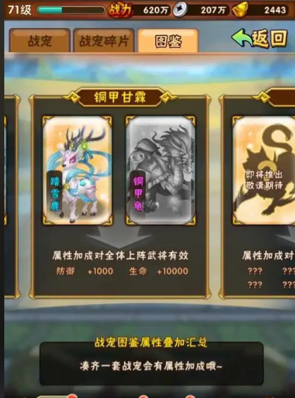 就是战宠的出战和护佑区别。出战是指战宠直接上场释放技能,影响的是整个队伍的即时战斗效果;而护佑则是将战宠分配给某个特定武将,永久提升该武将的基础属性(比如攻击力高的宠护佑主将,生命防御高的宠护佑副将)。一个金宠可能出战效果并非最优,但护佑属性却极其出色。比如攻击型的金宠通常护佑时加的攻击多,更适合给主力输出武将配备;而防御型的金宠护佑时加的血量和防御多,用来保护辅助或副将更合适。你需要根据战宠的属性和你阵容的需求,灵活决定是让它出战发挥技能特效,还是安心做一名提供属性的背后灵。