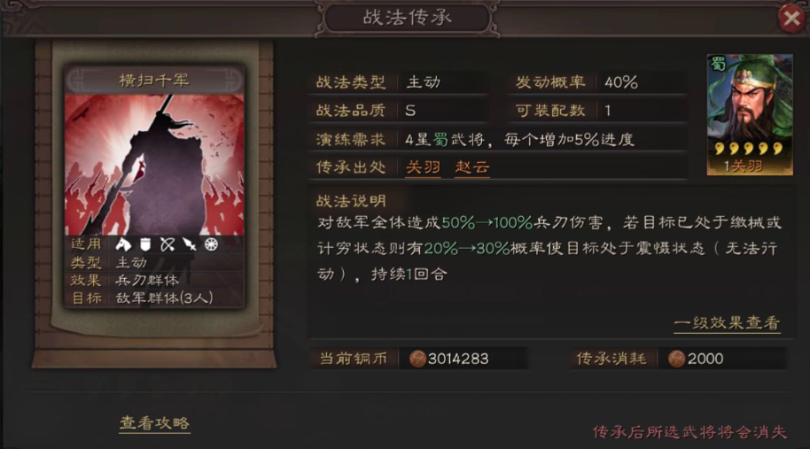 说到具体战法的选择,轻勇飞燕可以说是许褚的黄金搭档,几乎是必选项。这个A级战法能够对敌军单体随机造成2到4次兵刃伤害,本来伤害可能会分散,但有了虎痴的锁定机制,这好几下攻击会全部砸在同一个敌人身上,瞬间的爆发力非常恐怖。另一个常见的搭配是暴敛四方,它的发动概率不错,能稳定打出两次伤害,同样受益于锁定机制。如果你想追求更极致的单点突破,像落凤、短兵相见这类高伤害率的单体战法也是不错的选择。如果你让许褚担任主将,尤其是在骑兵队伍里,百骑劫营也能有很好的发挥,它能在普攻后追加伤害,并且有概率额外攻击敌军主将,配合锁定机制有望实现快速爆头。许褚的战法搭配公式比较固定,核心就是虎痴+轻勇飞燕+另一单体输出战法。需像所向披靡、横扫千军这类虽然是强力全体战法,但无法享受锁定集中伤害的效果,所以并不适合许褚。