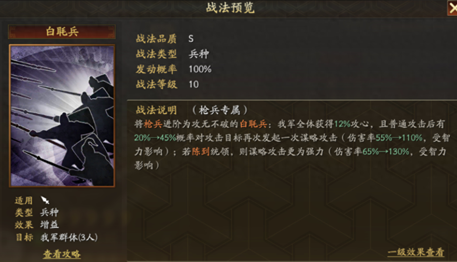 游戏内战争体系的设定也进一步放大了蜀枪的特点。枪兵营科技在满级时提供的伤害加成,以及战斗首回合枪兵获得的破阵效果,都为蜀枪的瞬间爆发能力添砖加瓦。这使得蜀枪阵容尤其擅长在前几回合建立优势,符合当前以速攻和控制为主的对抗环境。阵容的核心在于控制与输出间的紧密配合,有时甚至为了追求极致的控制与爆发效率,会主动放弃续航类战法的位置,通过强化防御与输出来确保持续作战能力。类似白毦兵这样的特种兵战法,能为蜀枪体系引入不受控制影响的谋略伤害,形成了物理与谋略的混合输出模式,这种混合伤害机制有效应对了单一类型防御较强的队伍,增强了阵容的全面性和破阵能力。