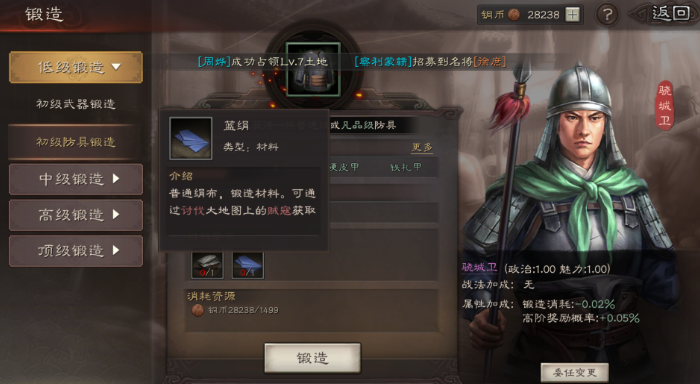 打造装备需要消耗材料,主要是铁矿、铜币,以及各种特定的图纸和矿石。这些材料怎么来呢,主要是通过讨伐地图上的贼寇来掉落,特别是8级以上的高级贼寇,掉的材料更好。图纸除了打贼寇,还能通过寻访台有一定机会获得。你可以委任一个武将当锻造官,这个职位最好选择魅力值高的武将,因为魅力值能增加打造出高阶装备的概率。如果有像曹植、步练师这种自带锻造增益技能的武将,那就更合适了,他们能进一步提升效率。