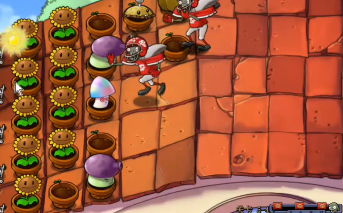 关卡中后期需要针对性处理橄榄球僵尸、梯子僵尸和跳跳僵尸的组合攻势。对于成群的橄榄球僵尸,除了依靠高坚果阻挡和忧郁菇输出外,可以预判性地使用土豆雷进行范围杀伤,并配合寒冰菇的冻结效果延缓其推进。梯子僵尸的行为可以被巧妙利用,让其将梯子搭在南瓜头上反而能形成一种临时保护,但需注意及时修补即将破损的南瓜。跳跳僵尸能够越过前排防御,因此必须确保每条战线都有充足的火力覆盖,忧郁菇的密集摆放是阻止其跳跃后突进的有效手段。在最终波次来袭时,应保留寒冰菇或樱桃炸弹等应急手段,并专注于修补防线缺口,维持核心输出植物的生存。
