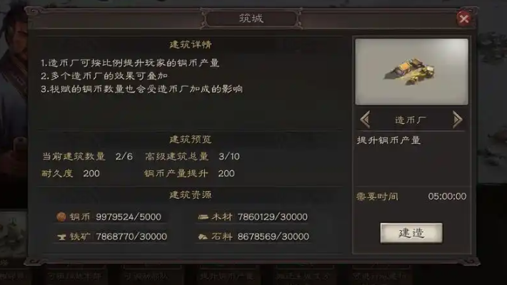 你可以建造各种功能建筑,这极大地拓展了领地的价值。造币厂可以稳定产出铜币,工坊能同时提升四种基础资源的产量。营帐则是一个关键的战术建筑,它能让你在远距离作战时快速恢复部队士气并支持征兵操作,避免了长途行军带来的战斗力损耗。你还可以建造箭塔、拒马等防御设施来保护你的领地,有效延缓或阻止敌人的进攻。