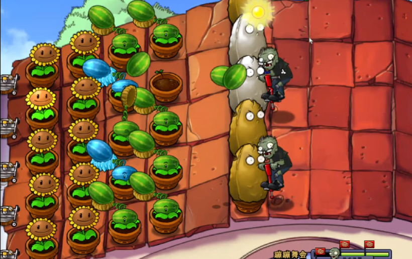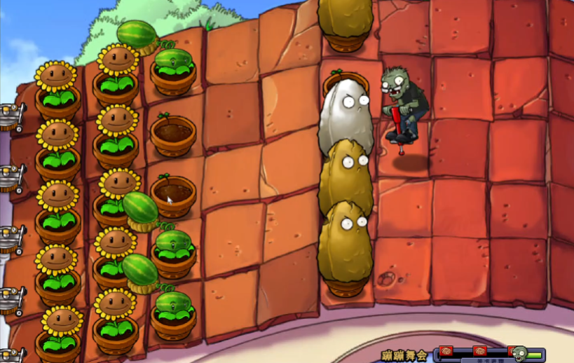 通关蹦蹦舞会关卡的关键在于选用能克制蹦蹦僵尸的植物并掌握好游戏节奏。蹦蹦僵尸踩着弹跳杆移动迅速,能轻松越过普通植物,因此必须使用磁力菇、高坚果或倭瓜等针对性的植物来应对,磁力菇可以吸走它的跳杆,高坚果能直接挡住它并使其撞掉跳杆,倭瓜则用于快速解决单个目标。这一关卡在屋顶场景进行,僵尸出现频繁,需要快速建立稳固的防线。