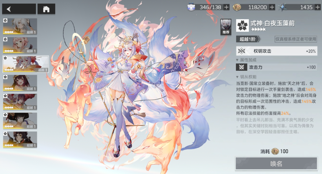 钥从对她的提升显著,专属五星钥从式神丶白夜玉藻前能在使用天或地之持时造成额外物理伤害并提升技能伤害,且效果随超越进阶增强。若无专属,替代选择包括五星钥从式神·萤狩青鹭火,其在暴击率高时增伤效果良好,以及四星钥从式神·稻妻雷兽,适合暴击率有一定基础的玩家,钥从系统无需升级,仅通过超越进阶提升。