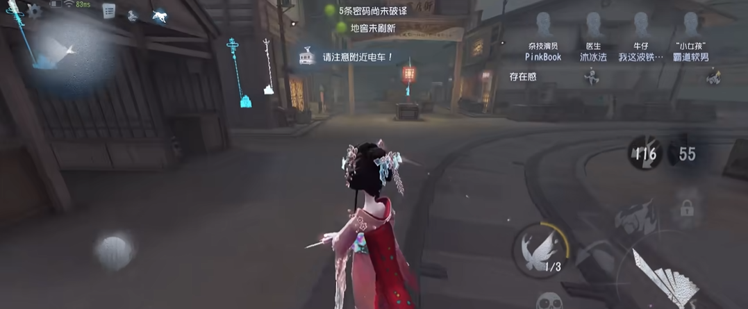 要确保技能刹那生灭不被求生者正面注视打断,一旦被断飞就会失去关键的机动性而陷入被动。守椅状态下尤其需要冷静,务必等待最佳的出刀时机,避免因贸然出刀打空后的僵直让前来救援的求生者成功救人或拉开距离。面对擅长绕板区博弈的求生者,红蝶需要掌握心理层面的技巧,例如在接近板子时故意做出一个轻微的停顿进行原地抽刀,这种节奏变化可能打乱对方的砸板预判,迫使对方做出错误选择。