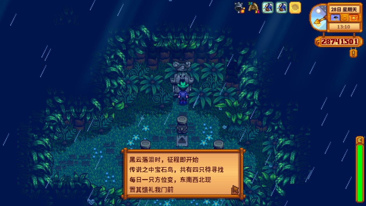 除了金核桃与化石,姜岛上还存在数个重要的支线收集任务。海盗妻子的任务链涉及拜访多位鹈鹕镇的居民以获取线索和关键物品,最终从沉船中找回项链,完成整个流程可获得5个金核桃。在姜岛农场解锁后,农场右侧的矿洞内可以接取青蛙美食家的任务,它会要求你按顺序在姜岛农场种植指定的作物,切记作物成熟后不可收获,等待任务结算,该任务总计奖励15个金核桃。宝石鸟解密是获取金核桃的另一种方式,在晴朗天气下,宝石鸟会随机出现在岛上的东部、南部、西部和北部四个区域,观察其颜色后,返回雷欧小屋附近的对应雕像处放置同色宝石即可,该谜题奖励5个金核桃。在岛屿南部海滩,雨天时会出现美人鱼谜题,需要根据提示完成长笛块的顺序激活以获得额外奖励。这些任务和谜题的完成,是推进姜岛全面探索与功能解锁的重要组成部分。