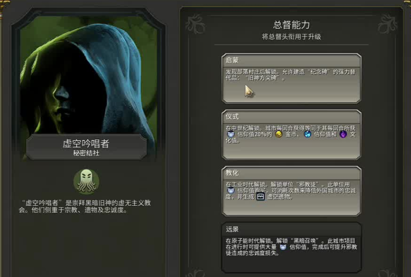 虚空吟唱者结社是一个高度契合瑞典特性的选择,该结社的次级能力旧日纪念碑能够提供一个额外的通用巨作槽位,这进一步强化了瑞典巨作管理的自动化优势,使其更早、更多地积累巨作以产生旅游业绩,而其核心转化能力,即能将部分信仰按比例转化为科技、文化和金币,能为瑞典提供全面而稳定的后期数值补充,尤其当瑞典通过圣地、遗物或城邦积累起可观的信仰值后,这种转化能有效支撑其文化、科技树的同步快速推进。