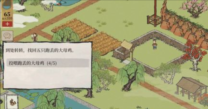 有一个任务要求玩家找回五只跑丢的大母鸡。这个任务需要你在地图中仔细探索,投喂这些大母鸡以完成目标。大母鸡散布在不同的地点,有些位置比较隐蔽,需要一定的耐心和策略来寻找。任务开始后,你可以通过到处转转来触发事件,每只大母鸡都需要你接近并互动才能收集。