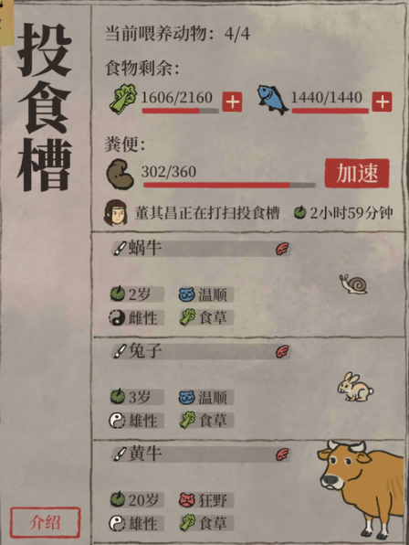 投食槽并非一成不变,它可以通过消耗名为补天石的特殊资源进行升级,以提升其各项容量。升级主要带来四个方面的增强:蔬菜存储容量、肉类存储容量、粪便收集容量以及可容纳的动物数量。从一级升至二级需要100补天石,二级升至三级需要200补天石,三级升至四级则需要300补天石。等级提升,各项容量数值显著增长,例如动物容量会从一级的3只逐步增加到四级的6只,而粪便容量等也会相应大幅提升。定期清理粪便槽是维持饲养环境的必要操作,部分拥有特定特性的居民可以更高效地完成此项工作。