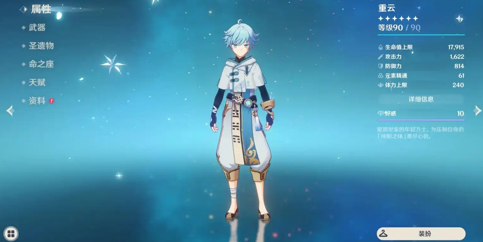 圣遗物方面,宗室两件套与冰风两件套的组合能同时提升元素爆发伤害和冰元素加成,是泛用性最强的搭配。若队伍中存在其他宗室四件套角色,重云可选择冰套两件加乐团两件来强化元素反应伤害。主词条优先选择攻击沙、冰伤杯和双暴头,副词条以暴击、爆伤和元素充能为主。需注意元素精通仅在打融化反应时有收益,常规配装不必刻意堆叠。
