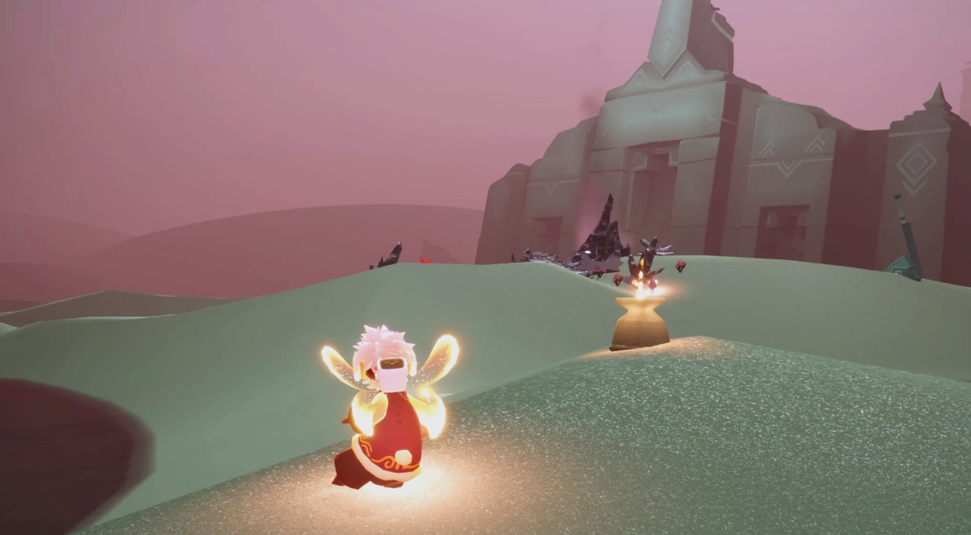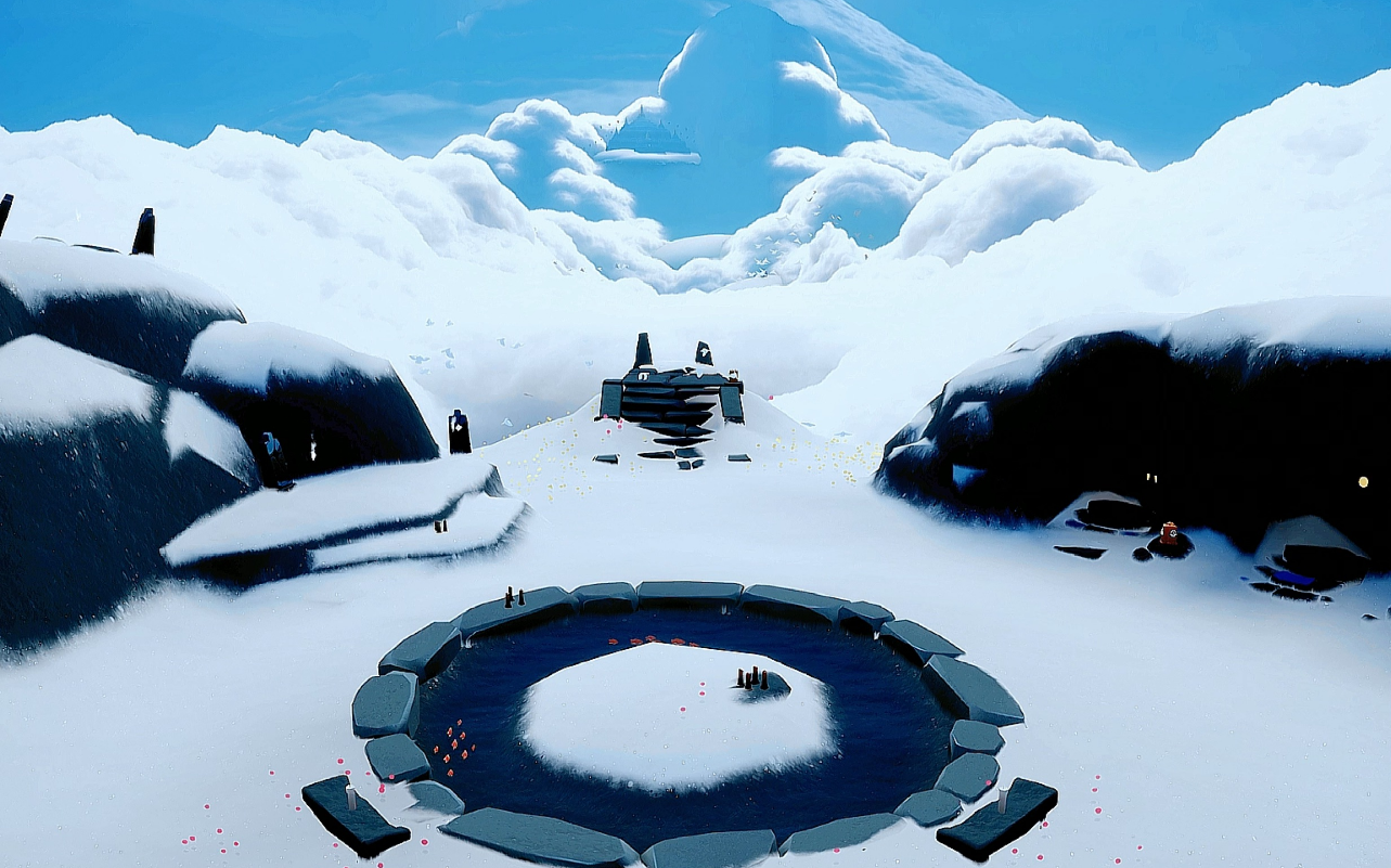 霞谷的冰雪覆盖山峰是另一个容易卡关的地方,可以从山洞朝太阳方向飞,找到那座孤立的山峰。这里的地形比较陡峭,飞行时注意保留体力,避免中途坠落。如果遇到滑冰场冥想任务,直接滑到右侧平台就能看到先祖。