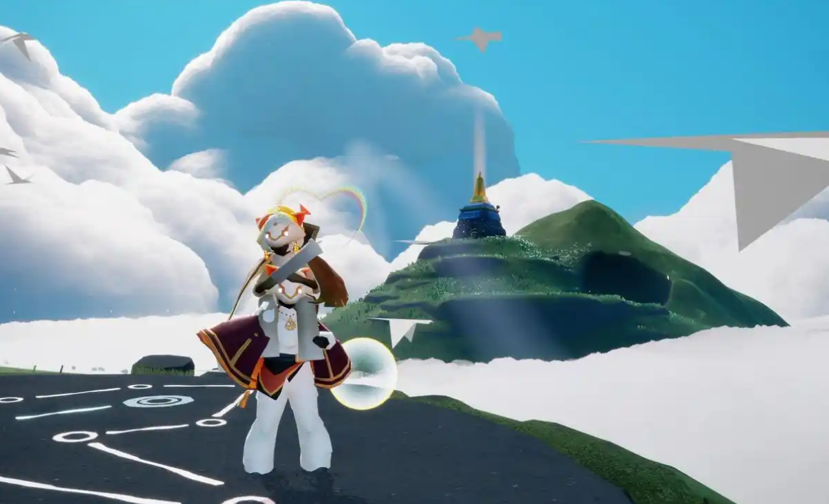 如果是一个人打卡,可以试试从重生之路那边飞。献祭完出来往大门后面飞,天空会变成深蓝色,慢慢往上飘就能看到城堡的轮廓。这里的城堡不是实体的,没法直接站上去,可以在空中放道具停留,比如鲲灯或者小椅子,这样就能美美拍照啦。记得控制好能量,不然掉下去就得重新来过了。