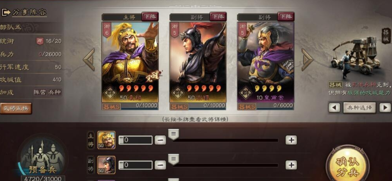 攻城部队需要分为主力部队和器械部队两种。主力部队负责消灭城池守军,需要选择战斗力强的武将和兵种;器械部队专门负责拆除城墙耐久度,虽然战斗力弱但攻城值很高。两种部队要配合使用,先让主力部队消灭守军,等守军被清除后再派出器械部队拆城。器械部队行军速度较慢,要注意提前部署,确保能和主力部队同步到达目标位置。