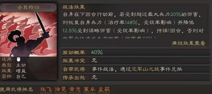 除了新武将,S8赛季还新增了事件战法击其惰归,这个战法特别适合张飞、徐晃这类高统率武将。战法效果分两种:如果受到高额伤害,会回血并减伤;如果伤害不高,则对敌方全体造成兵刃伤害。核弹张飞搭配这个战法非常强势,刚勇无前+击其惰归的组合能打出爆炸输出,同时还能兼顾生存。桃园盾也因为击其惰归的加入变得更肉,刘备的治疗加上战法的回血,让队伍续航能力大幅提升。