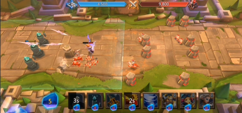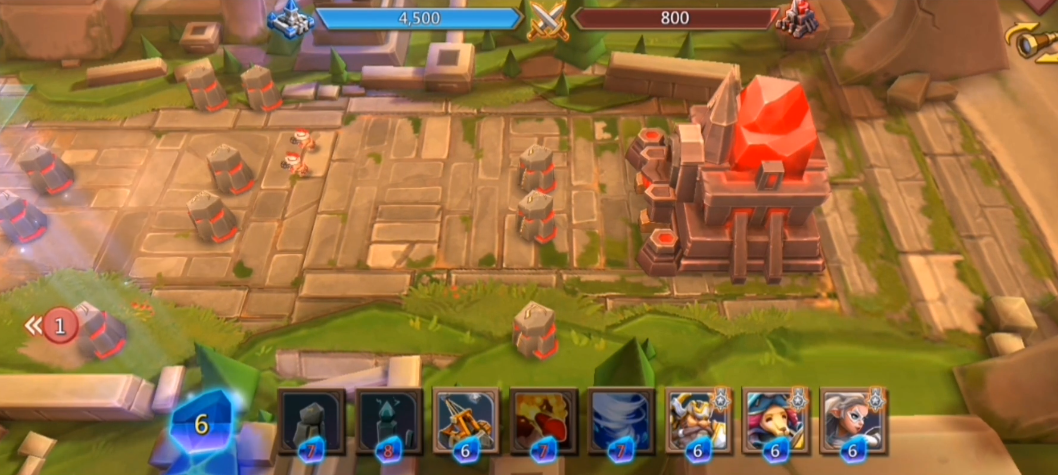 拆塔环节需依赖炮车和旋风技能,战术上先在前沿布置防御塔,后方放置炮车持续输出。敌方英雄出现时及时释放图腾并搭配肉盾保护。注意控制炮车与防御塔的距离,避免被范围攻击同时摧毁。该关卡兵线压力较大,建议优先处理敌方士兵再推进,保留清兵技能应对中期兵潮。
