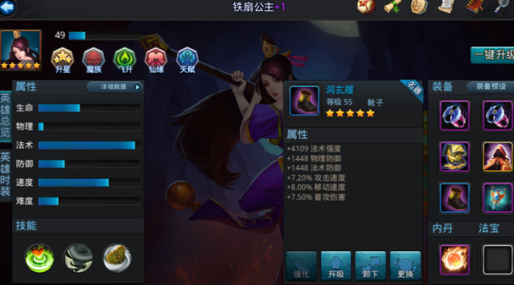 白骨精作为法术系代表,技能兼具消耗与回复能力,法术成长属性突出,适合推图与持久战。其操作门槛较低,技能机制简单直接,新手玩家能快速掌握输出节奏。铁扇公主则是平民必备辅助,系统通关即可获取,兼具治疗与控制能力,生命值与防御成长优秀,能为团队提供稳定生存保障。该英雄在排行榜防守阵容中尤为关键,配合嘲讽类技能可有效打乱敌方进攻节奏。
