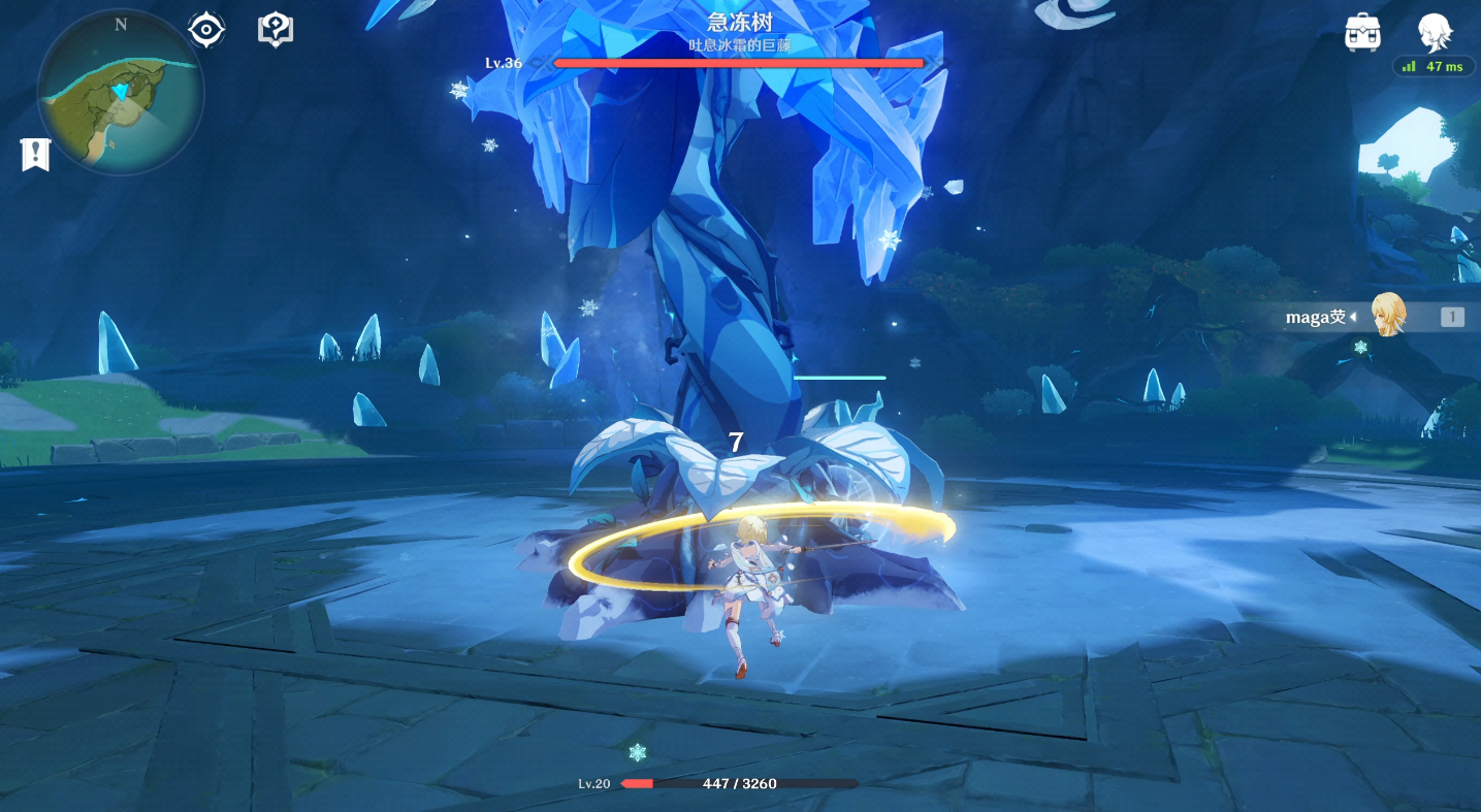 急冻树有一些麻烦的技能,比如全屏冰柱和冰冻领域。冰柱会追踪你,走Z字形路线能有效躲避。如果地面出现冰冻区域,立刻离开范围,否则会持续掉血。当它低头蓄力时,大概率要放范围冰爆,这时候跑远点或者绕到背后输出更安全。
