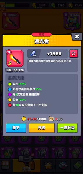 武器的强度不仅取决于基础属性,还与进阶系统密切相关。游戏中武器可通过合成提升品质,从白色、绿色、蓝色逐步升级至紫色、金色甚至红色。高阶武器会解锁额外效果,例如霰弹枪进化为加特林后射速和穿透能力显著增强,苦无达到红色品质后追踪性能进一步提升。玩家需优先收集同名武器进行合成,同时合理分配资源,避免因盲目升级导致战力失衡。武器与被动技能的搭配也至关重要,例如苦无搭配经验增益可强化追踪效果,棒球棍配合血量上限提升能增强生存能力。