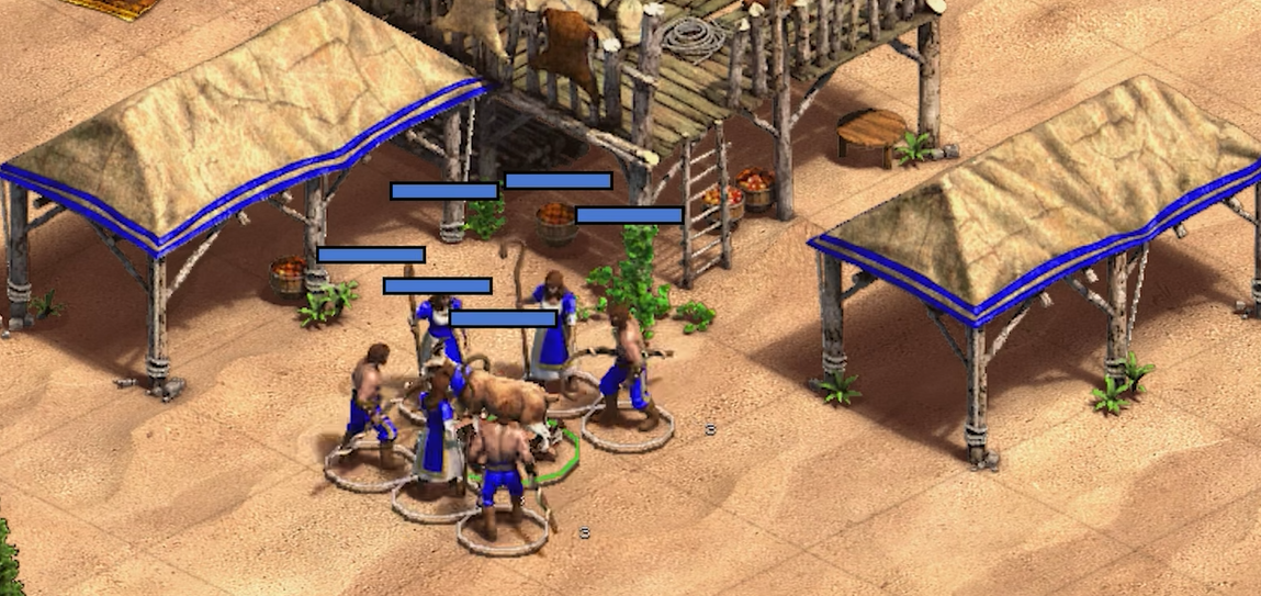 黑暗时代初期别急着把羊全部宰完,留1-2只在磨坊旁备用,防止食物断档。当羊快吃完时,提前派村民去引野猪或采集浆果过渡。引野猪要注意操作细节,让村民射箭后立刻往城镇中心跑,借助箭塔和村民集火安全击杀。羊和野猪提供的食物量足够支撑你到封建时代,期间记得保持15-18个村民持续采集食物,这是升级的关键保障。