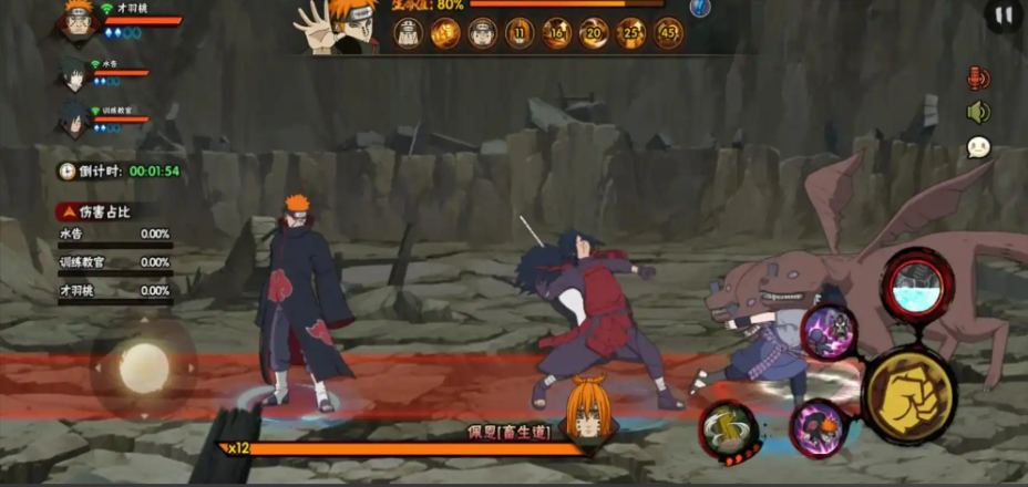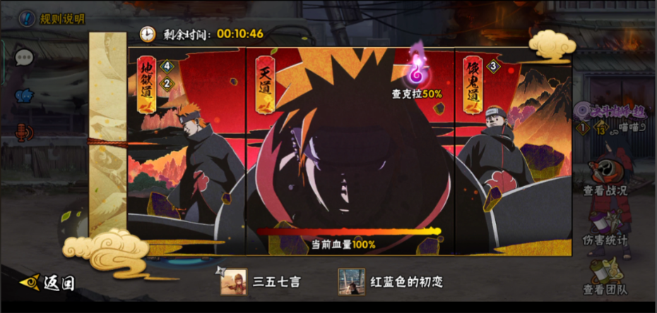 第二阶段重点打地狱道和饿鬼道来削弱天道。注意饿鬼道被蓝色泡泡包住时会回血,这时候停手等泡泡消失再打。天道开局查克拉100%是无敌的,必须靠打小BOSS压到50%以下才能输出。打天道前先拆五根柱子,队伍里别同时开大,否则容易触发神罗天征被秒。
