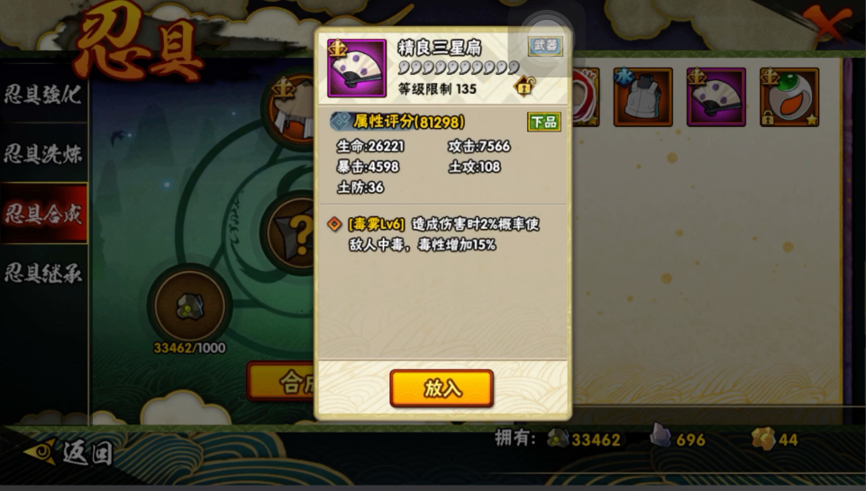 奖励方面修罗难度必掉紫色忍具,有概率出橙色究极忍具。如果没刷到想要的,可以把多余的传说忍具拿去合成碰运气。平时多攒忍具强化材料,拿到究极忍具后优先升级攻击属性。记得每周一刷新挑战次数,找靠谱车队效率更高。