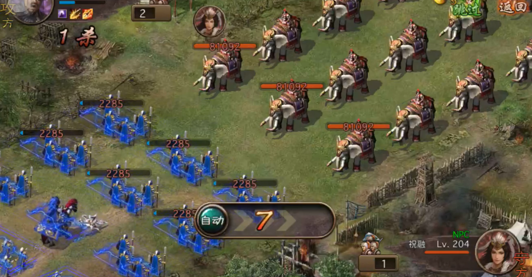 战斗时建议把吕蒙放在第一位,让他先吃伤害并尝试抵挡战法。孙策第二位,利用地形优势尽量多打几排兵,如果遇到克制情况可以不放战法,留着后面用。甘宁第三位,上场直接放技能秒掉第三波兵,然后剩下一排挡住祝融的战法。夏侯渊最后上,用来收尾。这个打法的核心就是让甘宁在关键时刻挡住祝融的技能,只要挡住了基本就能稳过。