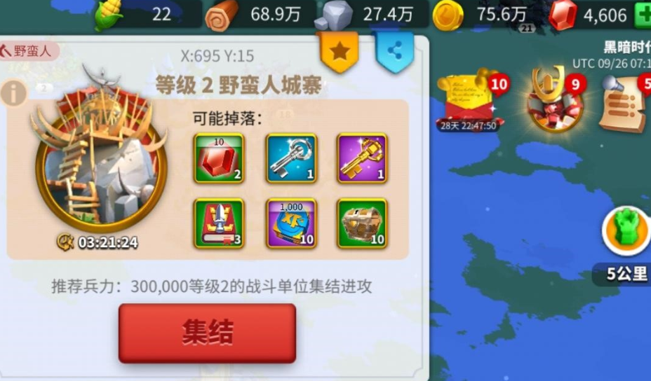 前期咱们需要重点关注木材、粮食和石料的基础资源积累,这些可以通过野外采集和资源点占领来稳定获取。随着城堡等级提升,誓盟之书会成为关键瓶颈材料,建议优先参与联盟组织的野蛮人城寨讨伐活动,组队击败城寨能稳定产出誓盟之书。联盟宝箱也是重要来源,记得积极参与联盟各项任务和活动。