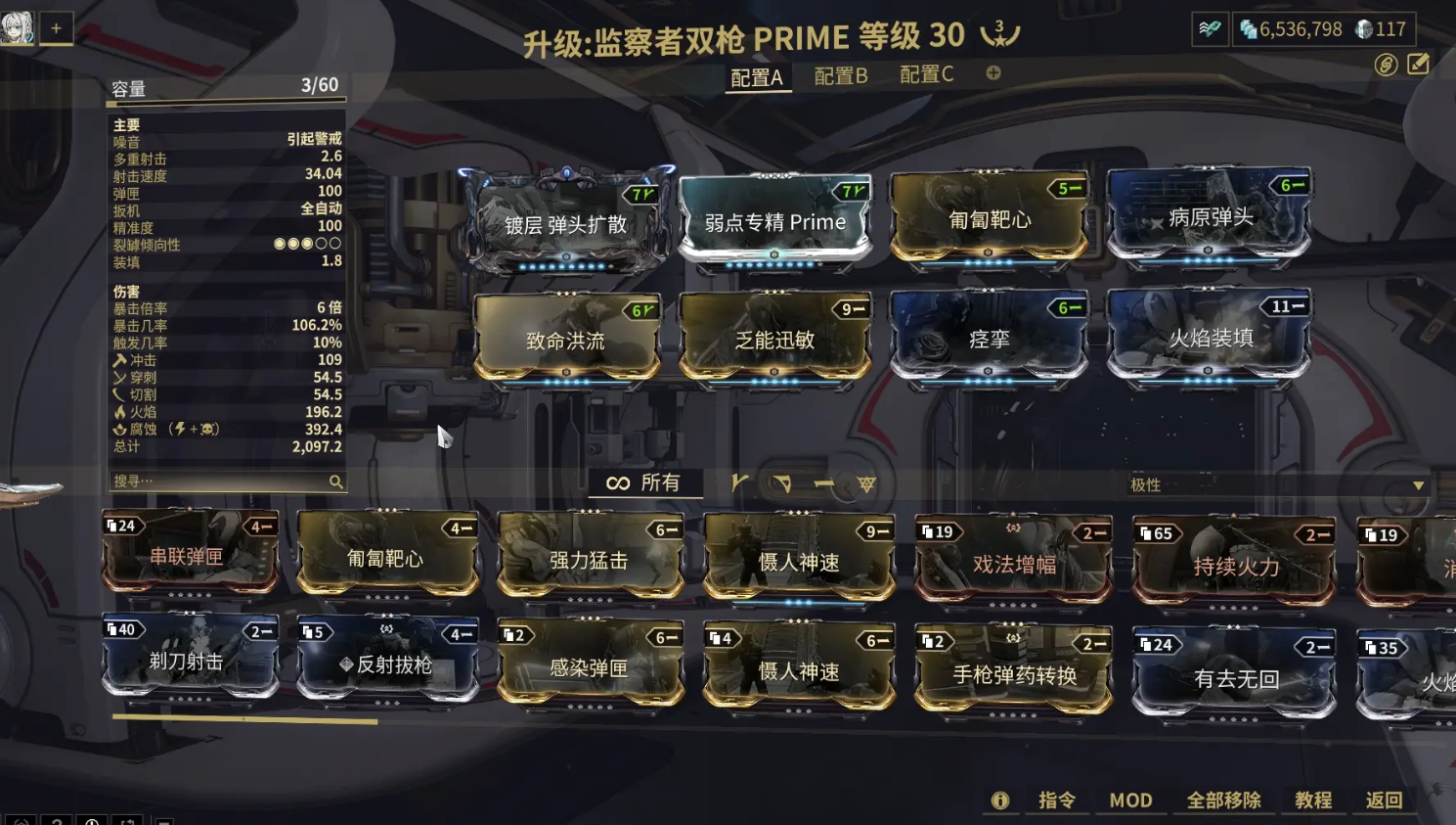 副武器的MOD配置需重点强化暴击率和暴击伤害,基础配卡包含致命洪流、弹头扩散、痉挛和病原弹头。若追求极致输出,可替换为镀层MOD提升触发效果。监察者双枪的绿石头(异况超量)能实现100%护甲剥离,但需搭配弱点专精和火焰填装弥补低触发率缺陷。主武器推荐选择破罩能力强的弗拉克斯或爆破枪,用于快速处理高护盾单位,为副武器创造输出环境。