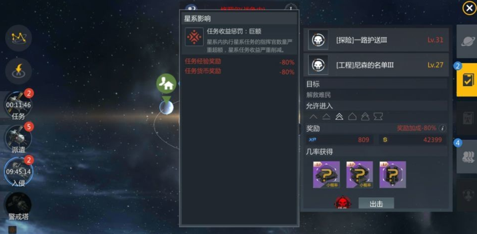 星系任务探针是获取星系任务的核心道具,探针分为星系任务探针、派遣任务探针和入侵任务探针三种,每种探针对应不同玩法。星系任务探针每4小时自动恢复1次,上限为4根,使用后可扫描当前星系并生成3个随机任务,任务类型包括战斗、采集或护送等。派遣任务探针每小时恢复1根,主要用于生成派遣任务,而入侵任务探针每10小时恢复1根,用于定位敌对玩家或NPC目标。