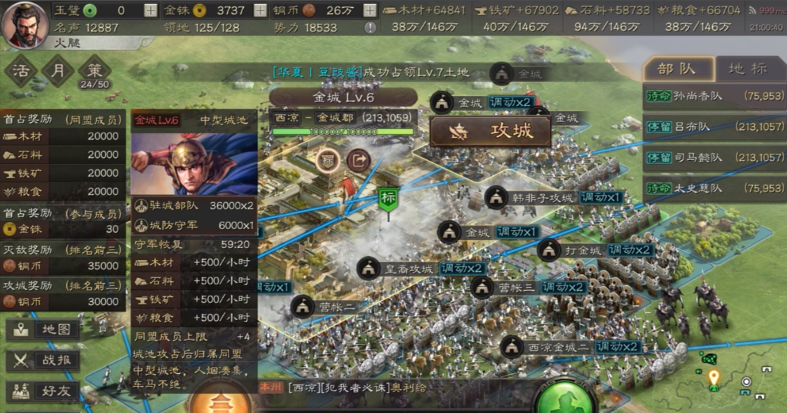 优先选兵种适应性高的武将带队,比如器械适性S或A的将,这样攻城值才够高。别小看三星将,有些带器械也挺好用。器械部队不用太在意等级,重点是把攻城值堆上去。如果资源够的话,可以提前练几队专门拆耐久的器械兵,这样攻城时就不会手忙脚乱。攻城前记得把士气补满,低士气的部队输出会大打折扣。攻城时注意节奏,别一股脑全冲上去。先让主力部队把守军和驻守清掉,等对面没兵了再派器械兵上去拆。如果发现对面耐久恢复太快,可能是他们升级了城墙或君王殿,这时候就得调整策略,要么加大攻势,要么先撤回来等机会。