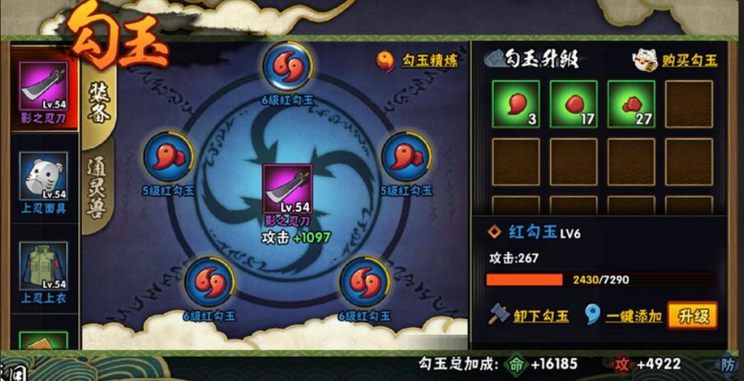 每件装备最多镶嵌5个勾玉,勾玉可以通过妙木仙境副本或商店购买获得。高品质勾玉能大幅提升属性,低阶勾玉可以合成升级。进入勾玉界面后,选择装备槽位并拖入勾玉即可完成镶嵌。记得定期检查背包,把多余的勾玉合成更高阶,这样战力加成会更可观。