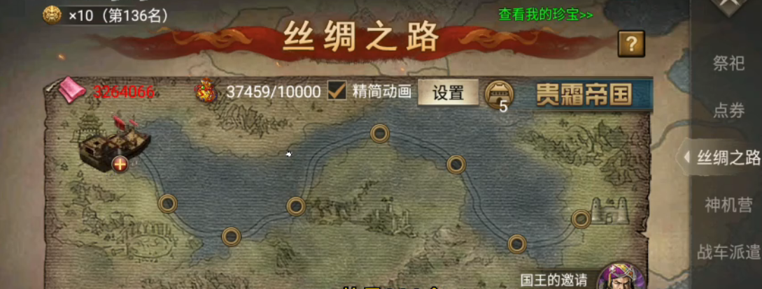 跑十珍关键在于合理利用游戏机制和资源积累。首先进入游戏右下角菜单打开资源界面,然后在正上方菜单找到丝绸之路并点击进入。这里就是获取十珍的核心区域,每次派遣都需要消耗丝绸和锦囊,所以平时要多攒这些材料。到了倒数第二格时会遇到关键选择,系统会给出三个选项:免费前进成功率极低,150金币有一定失败概率,600金币几乎稳过。咱们的目标是尽量不花金币,所以需要耐心重复尝试免费选项。