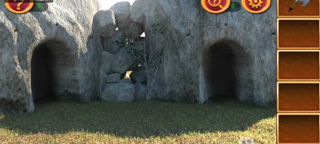 一开始会看到一片草地场景,需要仔细搜寻环境中的可用物品。首先点击地面上的斧头将其拾取,然后使用斧头砍断那些突出的树枝,砍下树枝后不要忘记收集树枝旁边的几块石头,这些基础工具是推进游戏进程的首要条件。收集完斧头和石块后,玩家需要进入右边的石洞探索。洞内设有一套复杂的机关系统,玩家必须按照一条固定的路线来安全通过。虽然具体的点击顺序没有在文本中详细说明,但通过多次尝试和耐心调整,总会找到那条通往内部空间的正确路径。