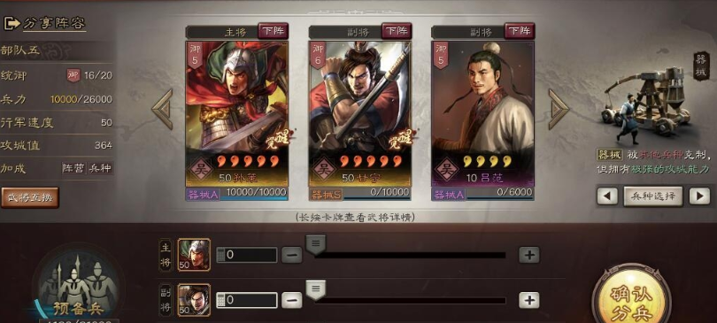 主力部队负责快速消灭城池驻守部队,需达到能稳定碾压守军的战力水平,优先选择高星级武将并利用兵种克制关系降低战损。器械部队则是拆城核心,必须配备高等级器械兵种,因为普通部队拆迁效率过低,可能导致战局反复,推荐使用输出与续航并重的组合,但需注意器械部队防御薄弱,移动速度慢,必须用主力部队保护好它们,避免被敌方偷袭。