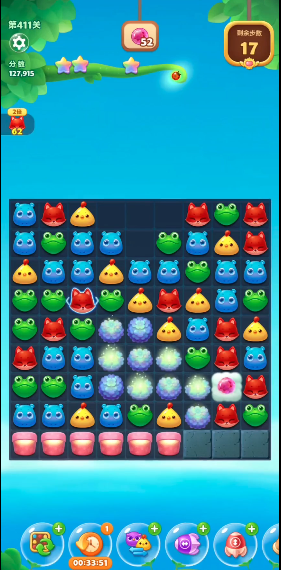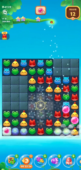 比如直线特效和爆炸特效,它们能快速清理大片雪块和帮助孵化鸡蛋。关卡中间有四个鸡蛋,消除它们周围的动物就能孵化出小黄鸡,这些小鸡会随机散落在棋盘上,可能触发额外的消除效果。尽量在早期多制造这些特效,特别是在雪块密集的区域使用,能有效提高效率。
