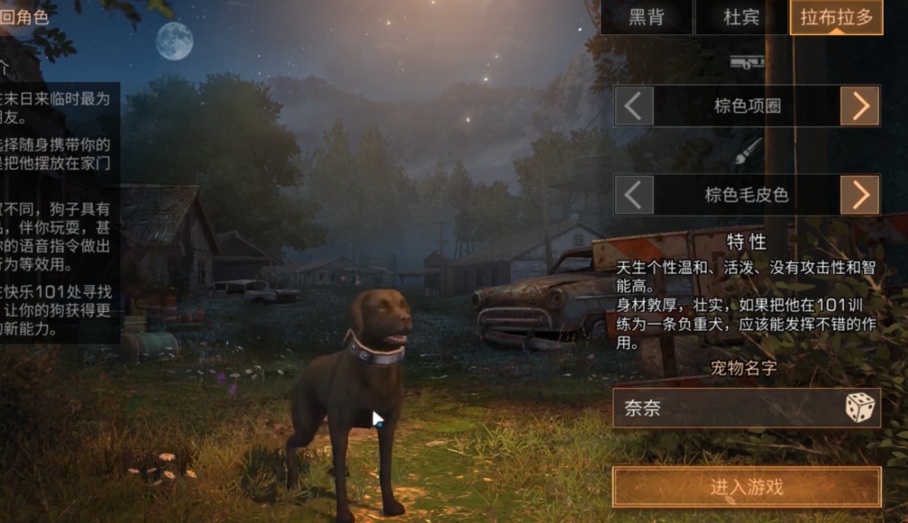 黑背犬是一种全能的宠物,特长是伴随在身边当搜寻犬,可以帮玩家拾取物品,并带有一些攻击能力。经过宠物训练后,它能提升搜寻物品的能力,降低搜索时间,提高物品的稀有度,适合喜欢探索和寻找资源的玩家。杜宾犬个性沉稳,极富感情,天生具有捍卫领土的特性,适合看家和战斗,训练后可以加成看家能力,但前期用处不大,更适合后期或注重防御的玩家。拉布拉多则是最多玩家选择的犬型,拥有较高的服从度,不具有攻击能力,但训练成负重犬后可以额外加成两格背包空间,非常适合新手和平民玩家,能大大缓解前期背包不足的压力。