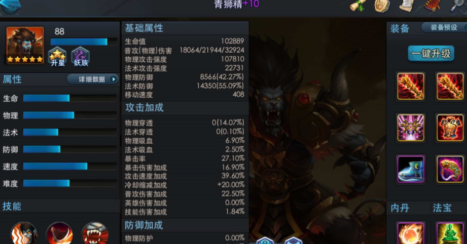 青狮精在后期就是个半肉半输出的战士,特别擅长对付法师。他的技能狮子吼不仅能打人,更重要的是能降低对面一大截的法术强度和移动速度,这对于后期那些依靠爆发输出的法系英雄来说简直是噩梦。等他升到五星,被动技能真·妖之障就更厉害了,能大幅减少自己受到的法术伤害,让他冲进敌方法师堆里的生存能力大大提升。可以说,后期青狮精的核心价值就是当一个法师杀手和团队的破防尖兵,专门用来撕开对面以法师为核心的阵容。